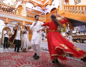2025年9月10日,來(lái)自巴基斯坦的游客韓帥(前右二)在新疆喀什古城景區(qū)“古麗的家”民宿與工作人員跳舞??κ补懦蔷皡^(qū)歷史底蘊(yùn)深厚,2025年1至7月,接待游客達(dá)1668.6萬(wàn)人次,實(shí)現(xiàn)旅游綜合收入74.7億元。新華社記者程麗 攝