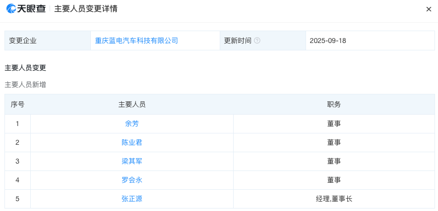 資料顯示,重慶藍電汽車科技有限公司于2025年9月17日成立,注冊資本為5億元,法定代表人為張正源,是一家以從事汽車制造業(yè)為主的企業(yè),包括汽車銷售、新能源汽車整車銷售、汽車零部件研發(fā)、汽車零部件及配件制造等。9月18日,該公司新增余芳、陳業(yè)君、梁其軍等5人,其中,余芳、陳業(yè)君、梁其軍、羅會永四人均為董事,張正源擔任經(jīng)理和董事長。