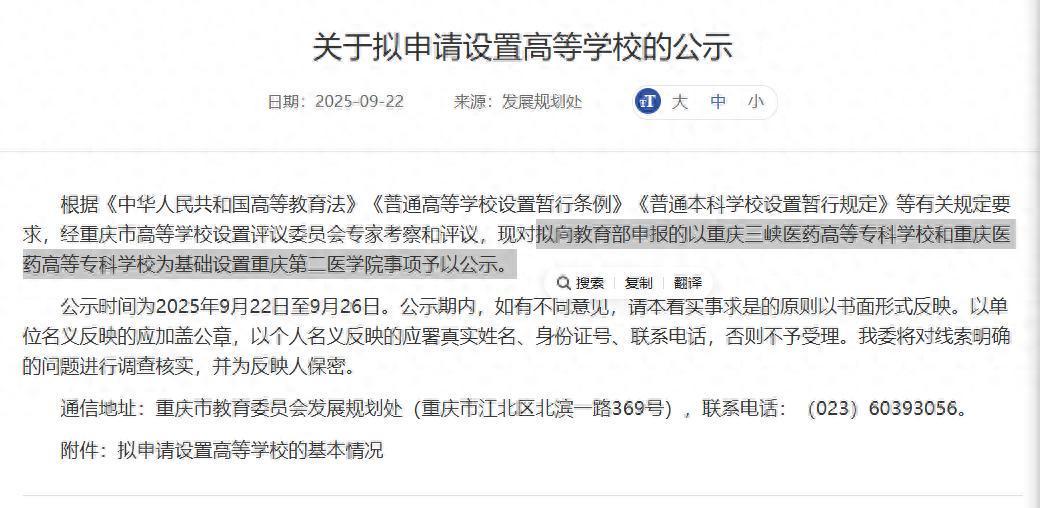 根據(jù)《中華人民共和國高等教育法》《普通高等學校設置暫行條例》《普通本科學校設置暫行規(guī)定》等有關規(guī)定要求,經重慶市高等學校設置評議委員會專家考察和評議,現(xiàn)對擬向教育部申報的以重慶三峽醫(yī)藥高等??茖W校和重慶醫(yī)藥高等??茖W校為基礎設置重慶第二醫(yī)學院事項予以公示。公示時間為2025年9月22日至9月26日。