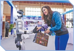 2025“一帶一路”媒體合作論壇聯(lián)合采訪團(tuán)成員與機(jī)器人互動(dòng)。