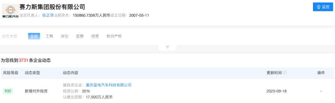 天眼查信息顯示,賽力斯集團股份有限公司(下稱“賽力斯”)新增一則對外投資。9月18日,賽力斯斥資1.75億入股新成立的重慶藍電汽車科技有限公司,成為后者最大股東。