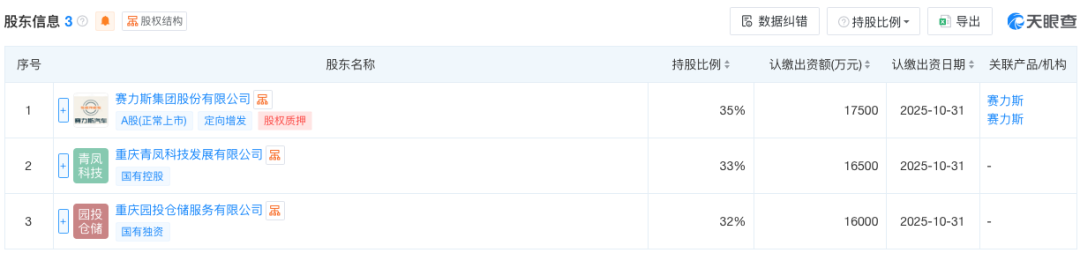 股東信息顯示,重慶藍電汽車科技有限公司由賽力斯集團股份有限公司、重慶青鳳科技發(fā)展有限公司、重慶園投倉儲服務(wù)有限公司共3家公司共同持股,后兩者為重慶國企,持股比例分別為35%、33%、32%,認繳出資額分別為17500萬元、16500萬元、16000萬元。也就是說,賽力斯集團股份有限公司是最大股東。賽力斯集團股份有限公司曾用名為重慶小康工業(yè)集團股份有限公司,于2007年5月成立,法定代表人為張正萍,注冊資本為150860.7359萬元,實繳資本為52599.9966萬元,是一家以從事汽車制造業(yè)為主的企業(yè)。
