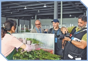 2025“一帶一路”媒體合作論壇聯(lián)合采訪團(tuán)成員在云南昆明參觀綠色高效花卉生產(chǎn)示范基地。